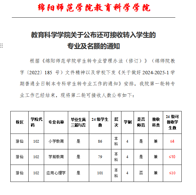 教育科学学院关于公布还可接收转入学生的专业及名额的通知